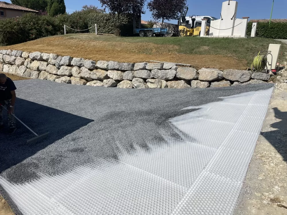Une surface stable pour éviter les déformations et garantir sa longévité. Huchon TP assure un terrassement précis, incluant le nivellement . La pose de structure alvéolaire optimise la résistance, tandis qu’un bon drainage prévient l’accumulation d’eau .